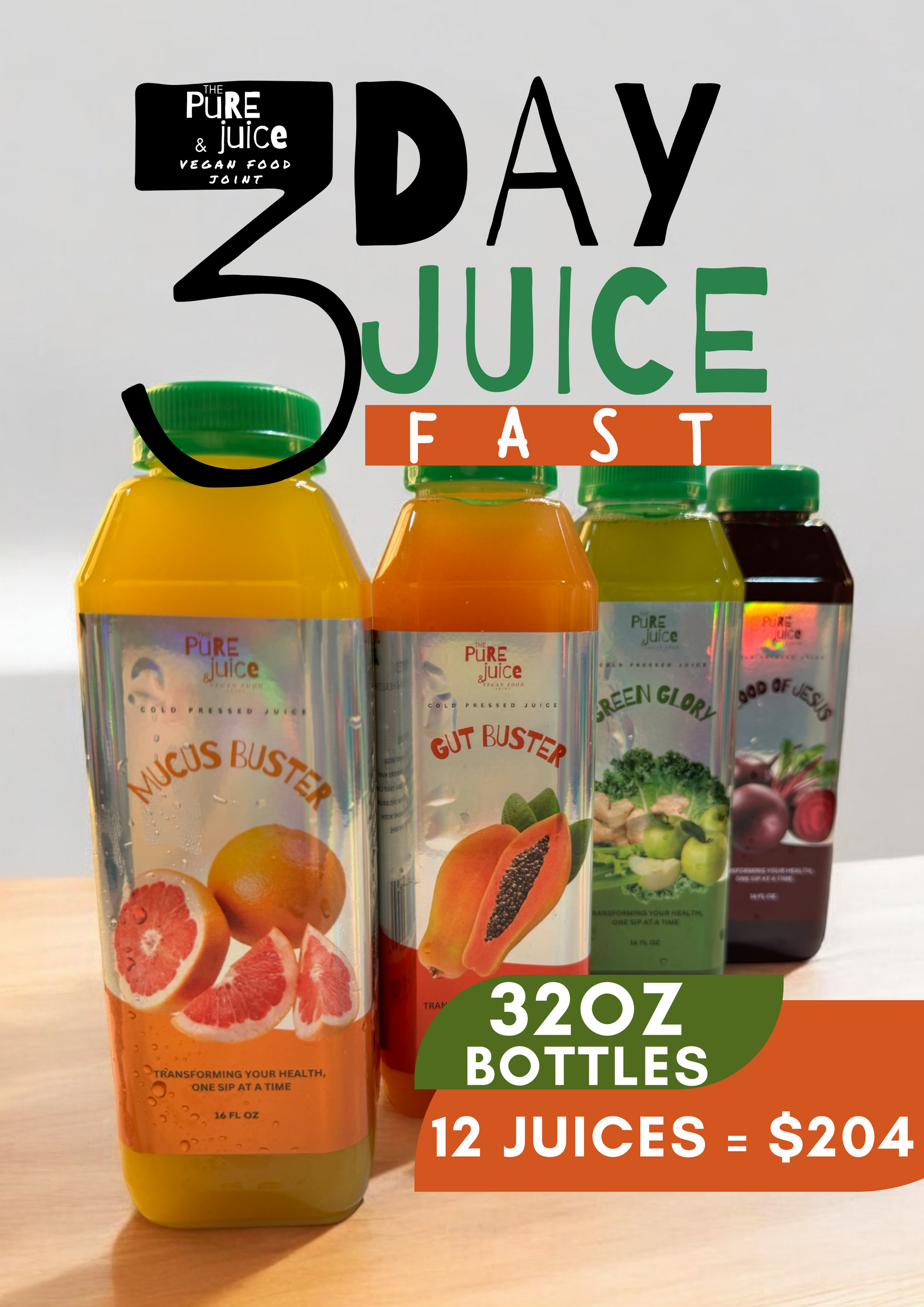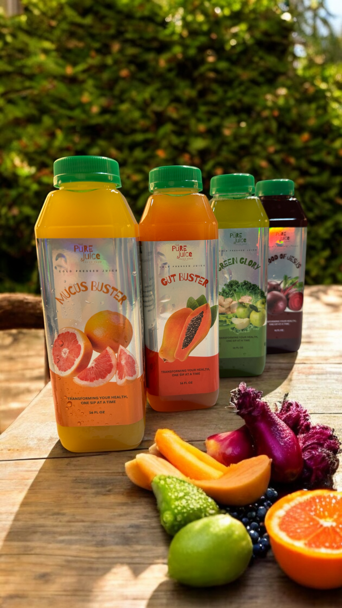 Our 3-day juice fast includes 4 carefully crafted juices per day, designed to support your detox journey. The recommended order is as follows: Mucus Buster, Gut Buster, Blood of Jesus, and Green Glory. To maximize the detoxification process, we suggest refraining from eating solid foods and consuming only distilled water during the fast.